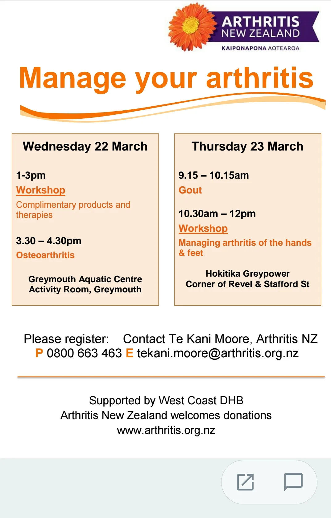 Manage your Arthritis - Greymouth Workshops 1pm - 4:30pm